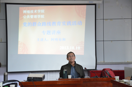 2013年10月10日下午,我院和网络技术学院共同邀请我国著名的党建研究、毛泽东思想研究、陈独秀研究专家阿明布和教授为全体党员、教师作党的群众路线教育实践活动专题辅导报告。公共管理学院党总支书记王雪莹老师和网络技术学院党总支副书记乾达门老师共同主持讲座,两个学院的全体党员、教师聆听了讲座。