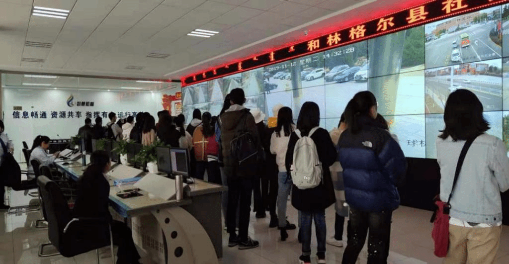 在和林格尔县社会管理指挥中心一楼大厅,同学们在监控大屏幕上直观地看到了各街道关卡路口的人员流动状况,指挥中心运用大数据与先进科学技术切实对全县区域进行了有效监控,以保障各企事业单位、学校、 街道、马路等区域的治安安全。期间,同学们积极向工作人员询问相关事宜,细致而全面的了解了指挥中心的工作职能亲眼看到了课堂上所学的公共组织的具体形态以及公共组织处理公共事务的具体场景,也感受到了先进科技与政务工作结合的优势。