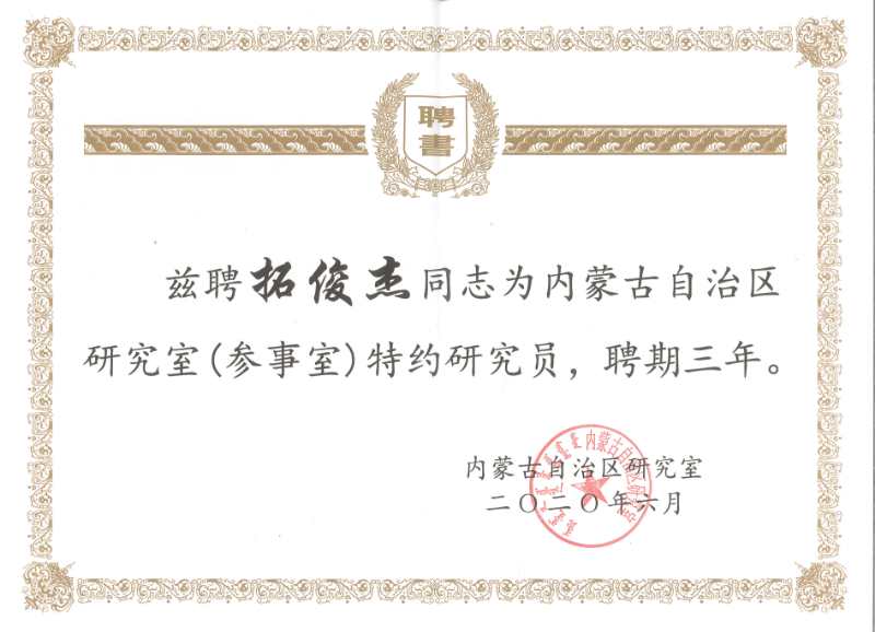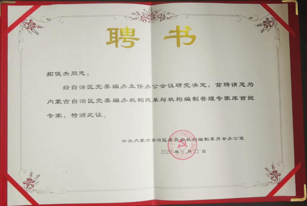 我院拓俊杰(院长、副教授、研究生导师)被内蒙古自治区研究室和自治区机构编制委员会分别聘任为特约研究员、首批特聘专家。