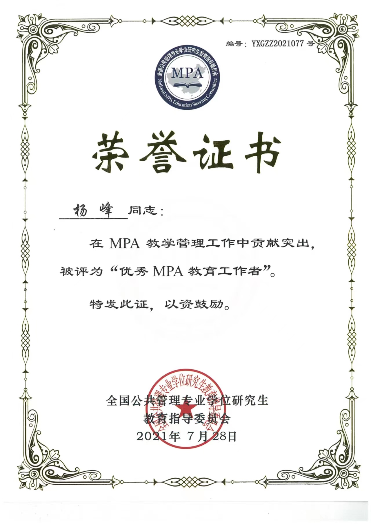 根据《全国优秀MPA教师和教育工作者评选办法》,经全国公共管理专业学位研究生(MPA)教育指导委员会组织审定,永利官网政府管理学院院长拓俊杰教授、MPA中心主任杨峰老师分别获评第三届全国“优秀MPA教师”、“优秀MPA教育工作者”荣誉称号。