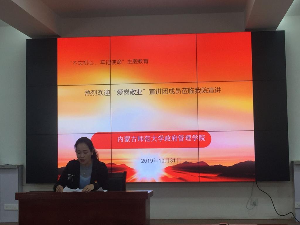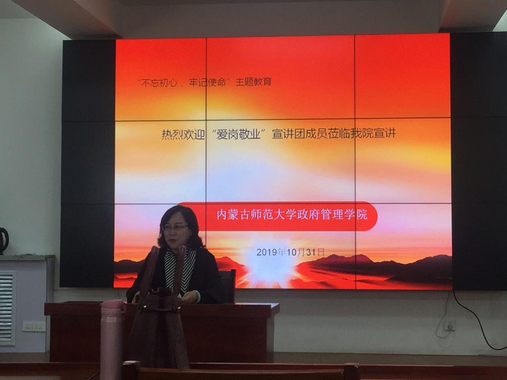 10月31日下午,政府管理学院党总支举行“不忘初心,牢记使命”主题教育专题报告会,邀请学校2019年度“三育人先进个人”张晓阳、朱晓红老师进行典型事迹巡讲报告。本次专题报告由公共事业管理系党支部组织委员、院工会主席于莎日娜主持和点评,院党总支书记樊荣忠、学院副书记、副院长乌日古木拉等领导与老师参加。