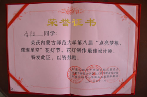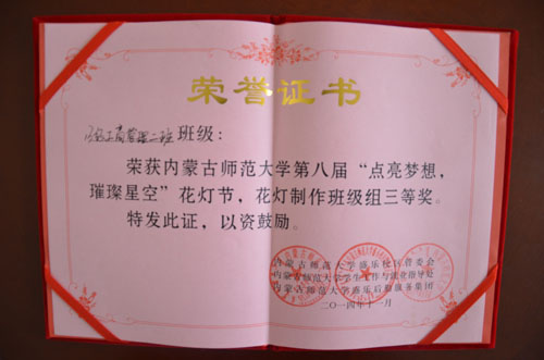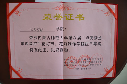 我院经过近一个月的努力,完成了两件作品参加了本次花灯节,最终我院获得了学院制作组第三名、2013级工商管理二班获得了班级制作组第三名的成绩。冯阳同学荣获制作最佳设计师称号。