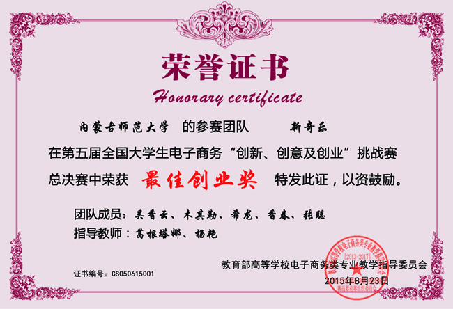 学院积极与大赛组委会和自治区组委会保持联系,为同学们争取更多机会。假期中,在获得组队参加全国总决赛的通知后,在时间十分紧张、任务十分繁重的情况下,部分学院领导、老师和同学放弃了休息时间,夜以继日,组织人员、策划选题、撰写文案、反复演练、不断调整完善思路、请专业人员指导PPT演示文稿的制作、多次组织院内外专家评审、精心选择参赛服装,等等,用不到一个月的时间,完成了其他参赛队四个月、一年甚至更长时间的准备工作,最终学院组织的“新奇乐团队”不负众望,在全国总决赛(现场赛)中获得了“二等奖”和单项奖“最佳创业奖”的优秀成绩,为学校和自治区赢得了荣誉。为此,学院领导、指导教师和工作人员放弃了假期休息,投入了大量的时间和精力,开展了卓有成效的备赛工作。其中,葛根塔娜老师牺牲了原先安排的个人重要事项时间,王雪莲、李艳茹老师不辞辛苦,全面落实参赛的各环节工作,杨艳老师虽远在外地,但也通过电子邮件对文案多次进行指导,专家组的老师多次现场指导,提出了许多中肯意见……在院领导的带领下,大家辛勤工作,为学院优秀成绩的取得提供了重要保证。