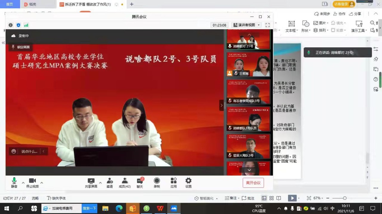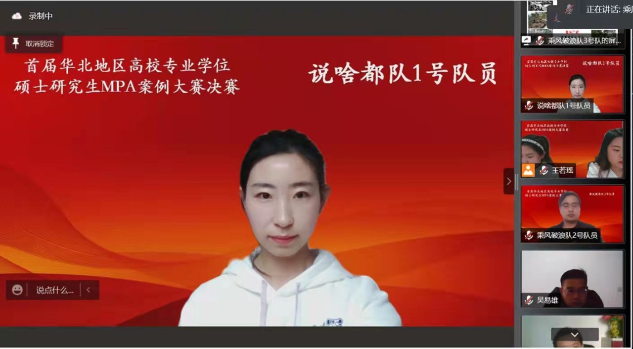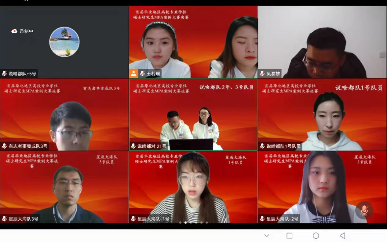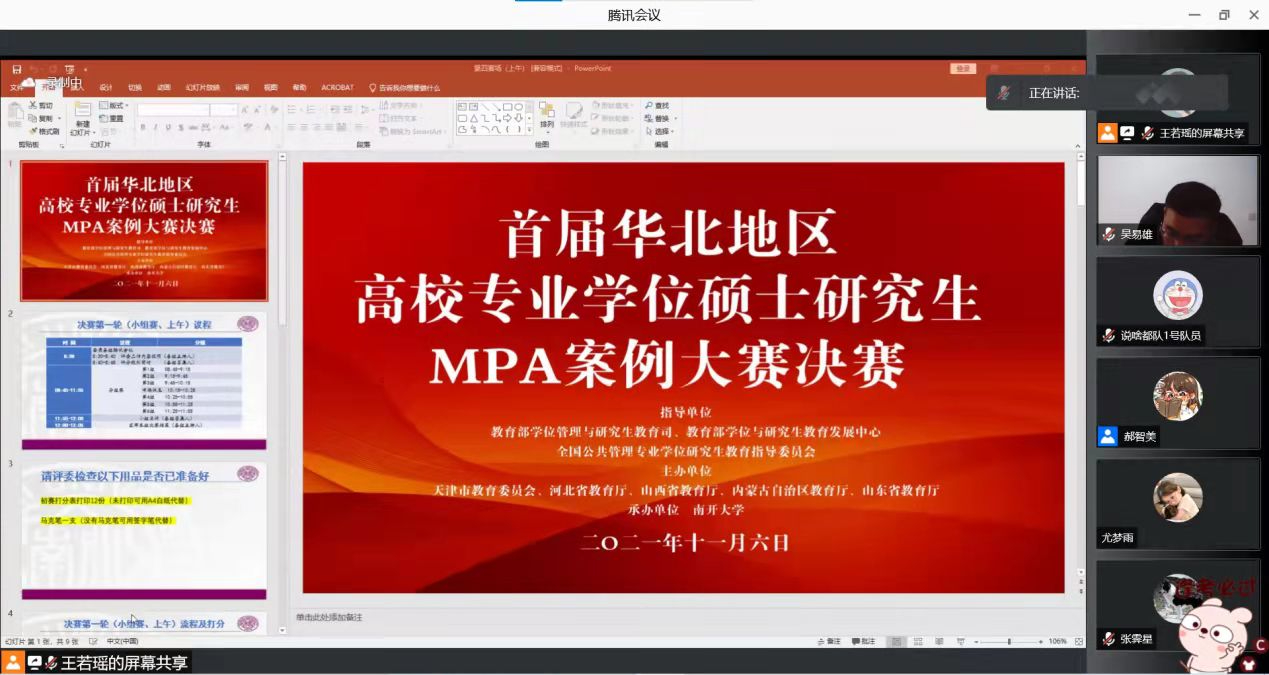 2021年11月6日,由教育部学位管理与研究生教育司、教育部学位与研究生教育发展中心、全国公共管理专业学位研究生教育指导委员会主办,南开大学承办的首届华北地区高校专业学位硕士研究生MPA案例大赛决赛隆重召开。来自天津、内蒙古、河北、山西、山东共 48支代表队,250多名MPA研究生参赛。我校政府管理学院拓俊杰院长作为大赛评委,全程参与了比赛,学院甘月文和拓俊杰两位教师指导的 “说啥都队”,杀入总决赛并斩获二等奖,取得我校在该项赛事上的开门红。